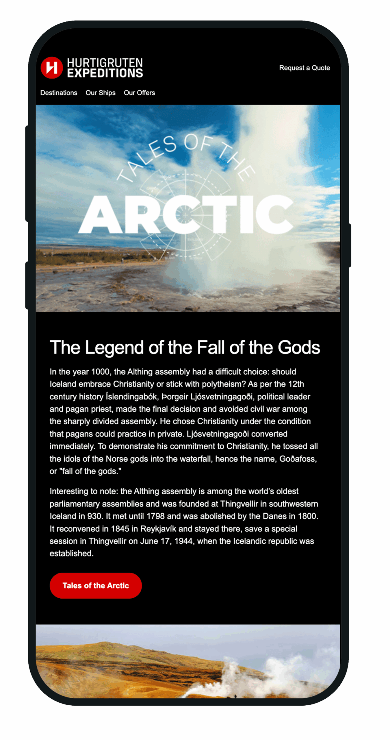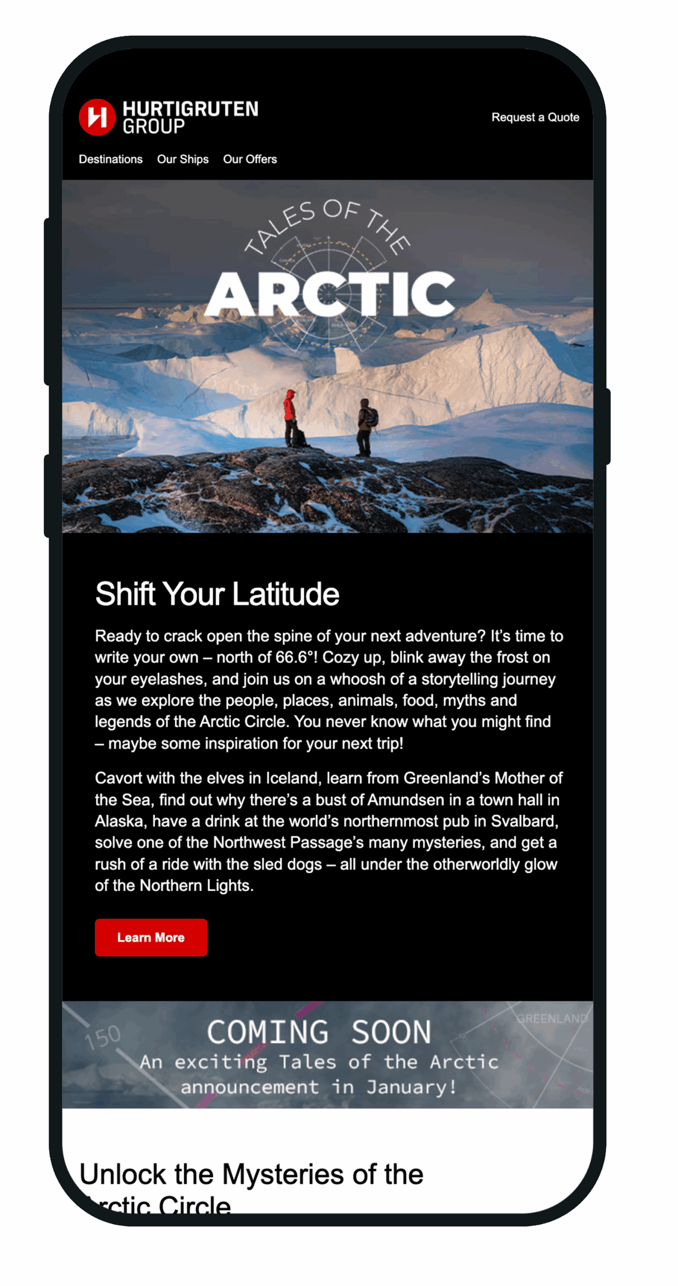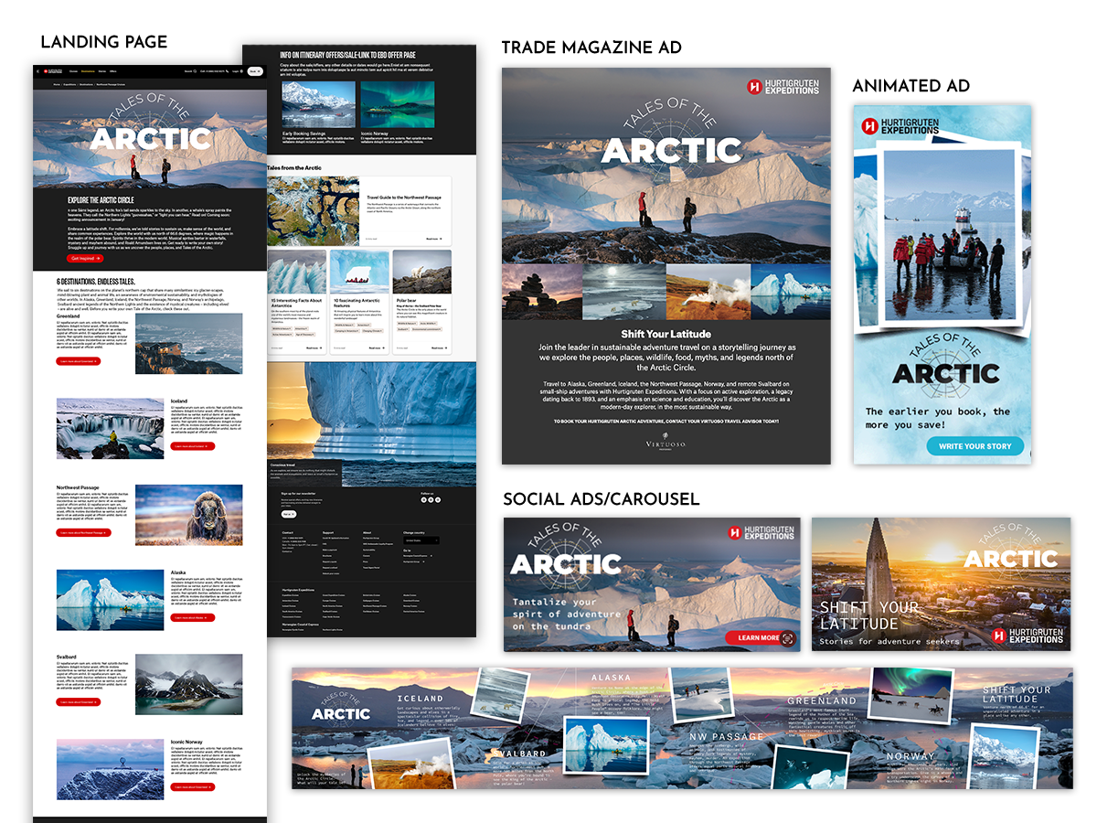 This storytelling-driven campaign was designed to boost engagement with our Arctic content and inspire future travelers. Because our site had limited content in this category, the goal was to draw visitors in through immersive stories and educational features. We measured success through increased page visits, time on sites, deeper email click-throughs, and any lift in Arctic bookings. The campaign focused on connection and curiosity—inviting travelers to explore one of the world’s most remote and awe-inspiring regions. The campaign focused on connection and curiosity—inviting travelers to explore one of the world’s most remote and awe-inspiring regions. The campaign was so successful that other markets asked for the assets to localize for their market.